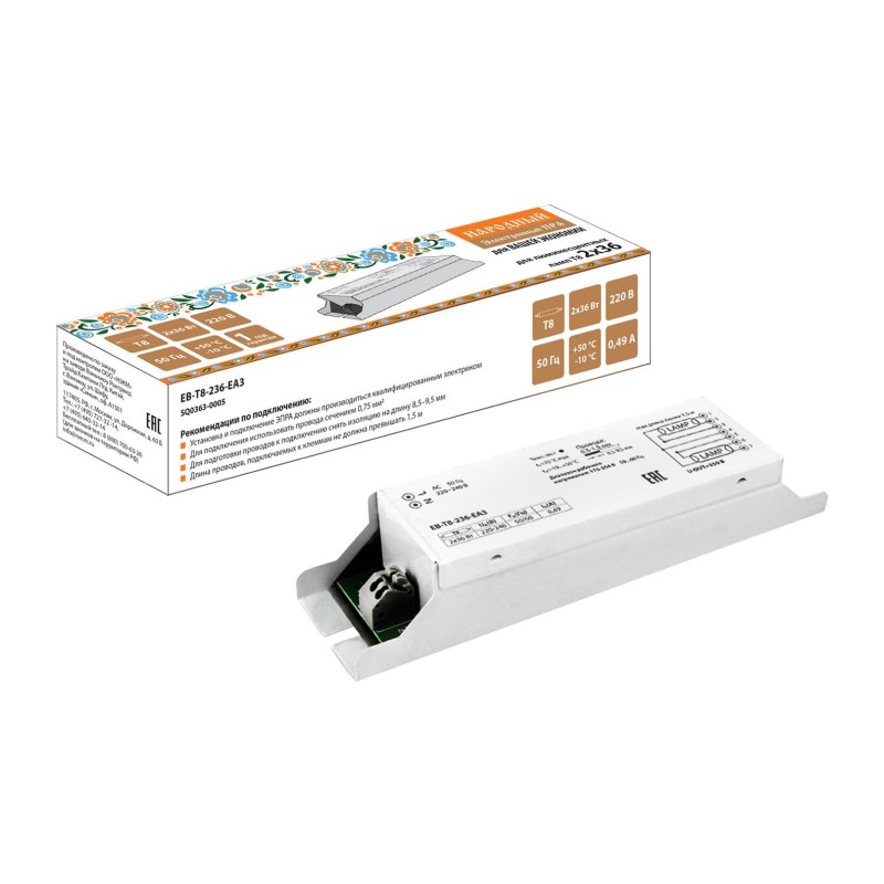 Электронный балласт ЭПРА для люминесцентных ламп Т8 (2х36Вт), 230В, метал.