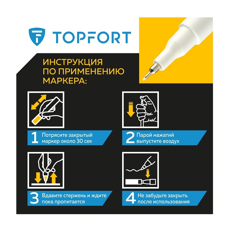 Предостережения: плотно закрывайте колпачок после применения, держать маркер вдали от источников тепла и воспламенения.