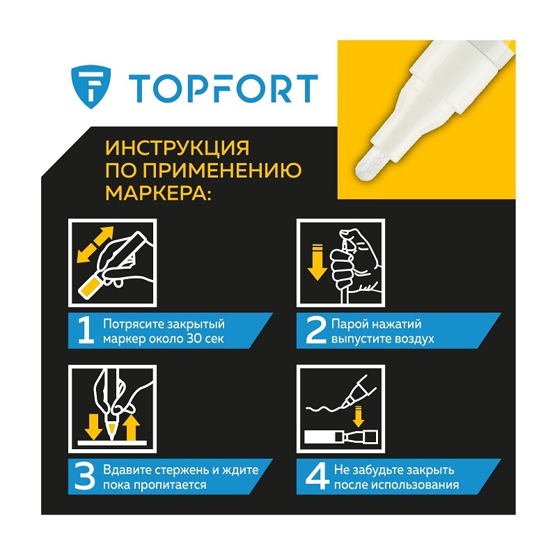 - Снимите колпачок, прижмите наконечник к поверхности, надавите до упора и удерживайте пока не проступит краска.