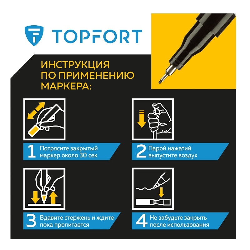 Предостережения: плотно закрывайте колпачок после применения, держать маркер вдали от источников тепла и воспламенения.